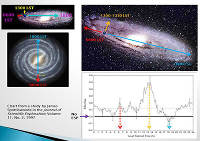 This is an astronomy term for the position of the Earth relative to the stars as it rotates around its axis. LST is constantly changing relative to clock time but there are tons of free apps available that will do it for you (astronomers being as poor as parapsychologists). This is because a solar day (which we use for clock time) is approximately four minutes longer than a sidereal day. This means that the LST only matches standard clock time one day of the year — on the vernal equinox, around September 22nd. Why does it matter? Because LST is one of the few physical factors that correlate with successful ESP performance and possibly MMI. Over thirty years of data from every laboratory around the world shows a 300-400% increase in ESP hit rate around 13:00-13:30 LST and a 0% hit rate (i.e. no success) at about 18:00-19:00 LST. Some have speculated that this is because there's less "noise" confusing the ESP signal. At the time of highest ESP success, we are looking straight up into deep space. But at the worst time, we're oriented so the entire flat plate of the galaxy is between us and outer space.